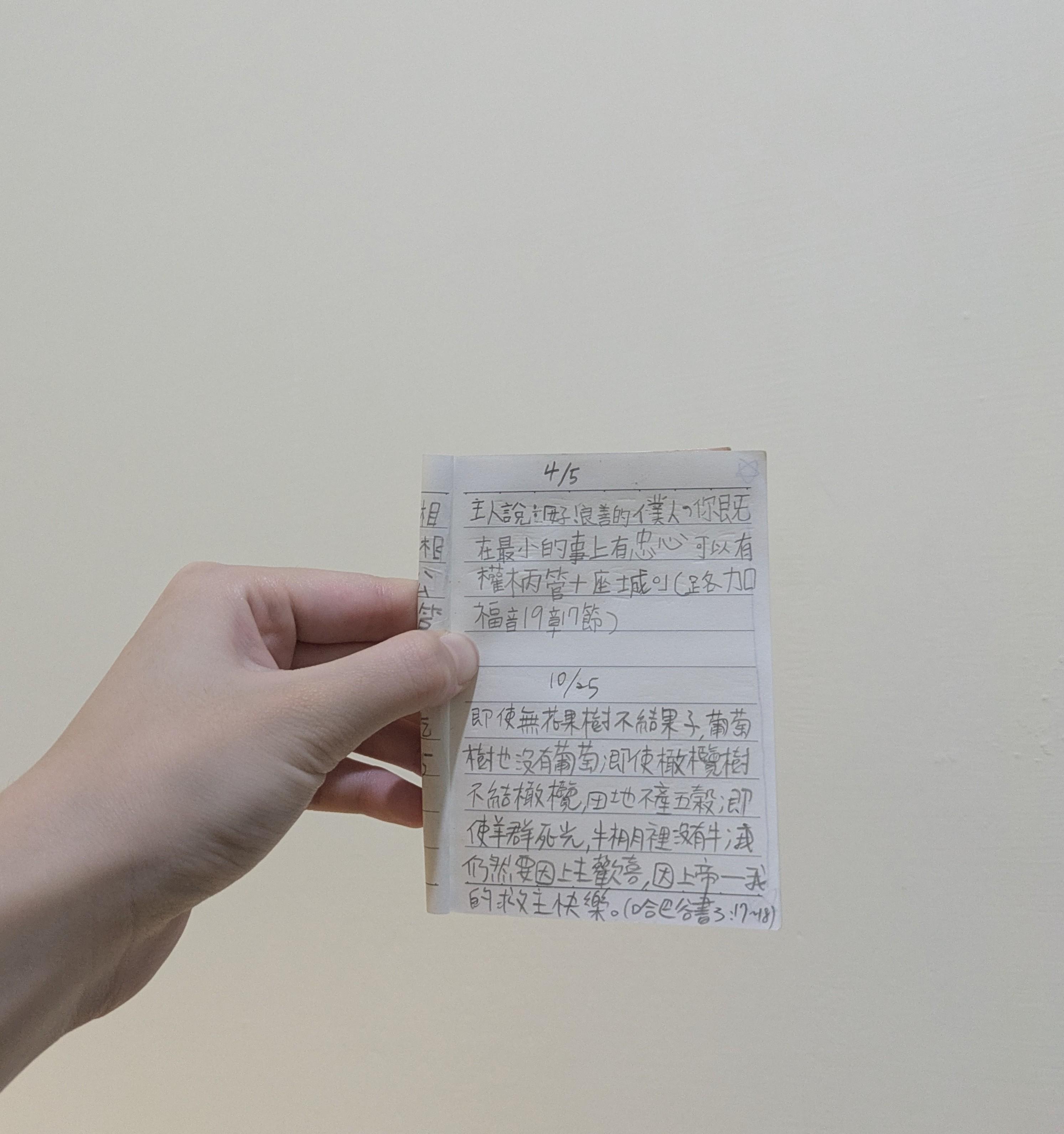 我喜歡到把它們拍下來當手機桌布了。正在惋惜自己為什麼不多抄一點的時候,突然覺得:「那就現在接著抄好了!」。這個(雲端硬碟)是可愛金句本的照片們,其中這張照片是現在接著抄的交接處。